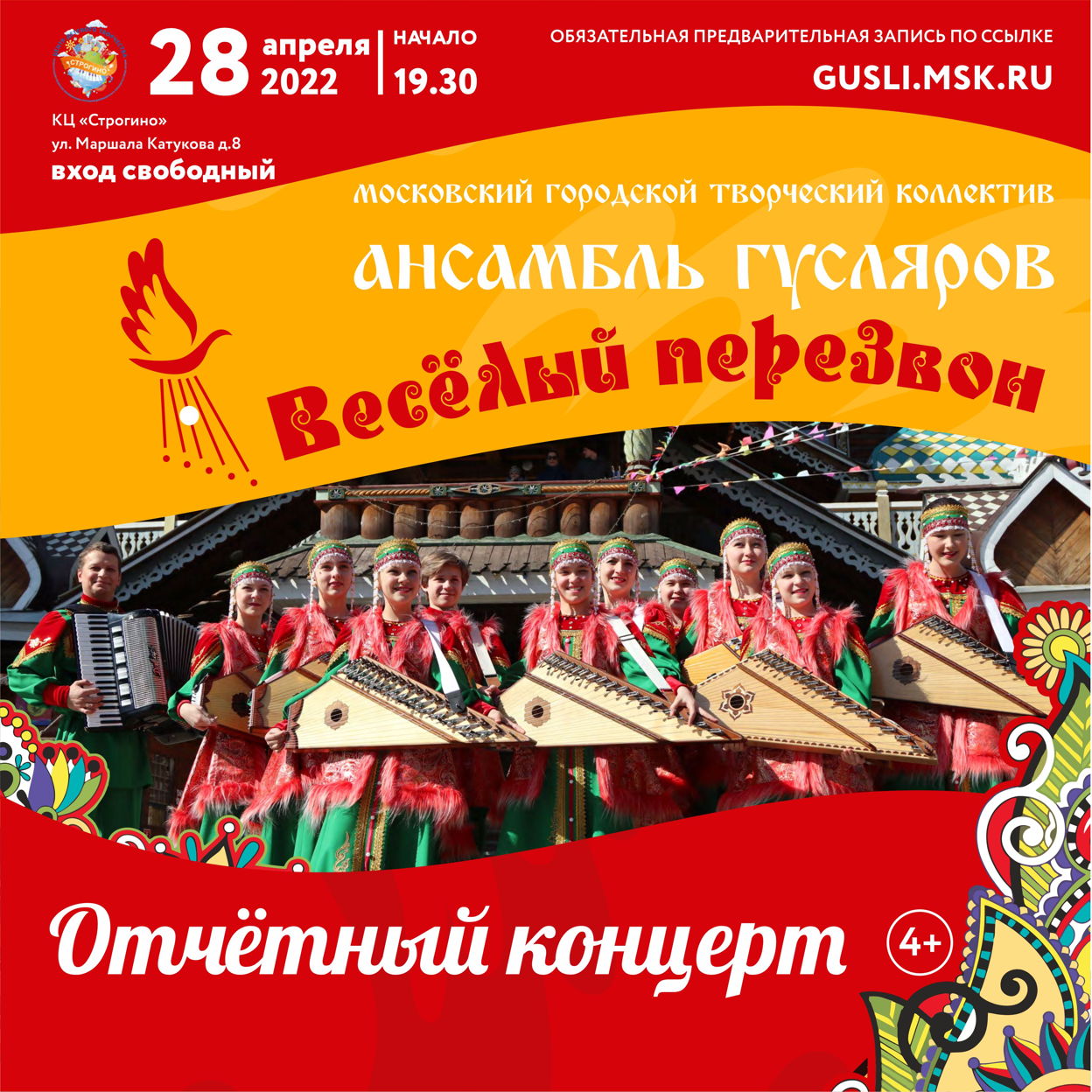 Дорогие друзья, ждем Вас на нашем отчетном концерте Ансамбля гусляров "Веселый перезвон", где все воспитанники коллектива от самых маленьких до старших ребят, наглядно продемонстрируют результаты своих усердных занятий.